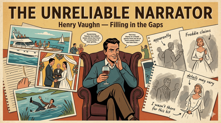 Henry tells the story with heavy sarcasm, admitting he wasn’t present for everything and filling gaps with gossip.